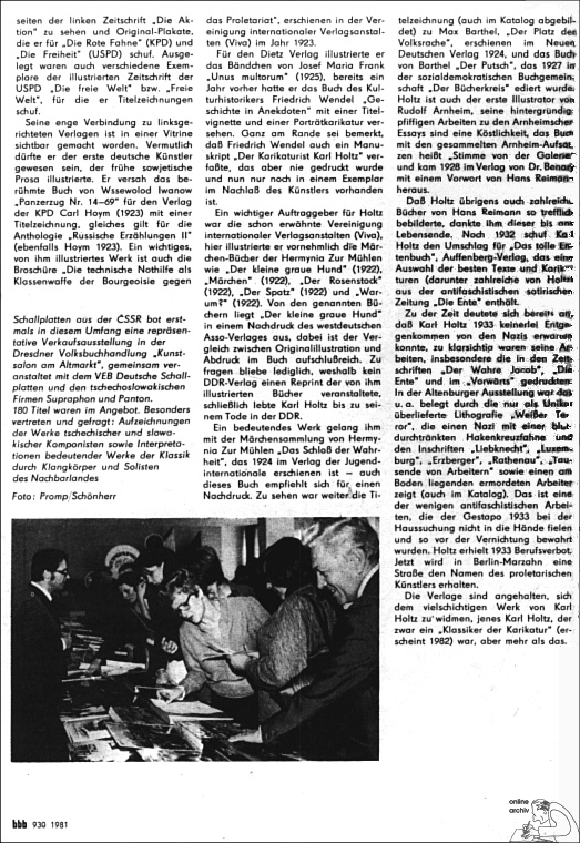 Doch nicht nur wegen dieser Neuentdeckung, denn so muß die Ausstellung gewertet werden, interessiert uns Karl Holtz, der übrigens in seinen letzten Lebensjahren dem Börsenblatt freundschaftlich verbunden war und uns so manche Karikatur zum Thema Buch und Leser zum Abdruck überließ. Das für Buchhändler und Verleger Interessante an der Exposition ist die Tatsache, daß auch des Buch- und Plakatkünstlers gedacht wurde. So waren - als Fotokopie -mehrere Titelseiten der linken Zeitschrift "Die Aktion" zu sehen und Original-Plakate, die er für "Die Rote Fahne" (KPD) und "Die Freiheit" (USPD) schuf. Ausgelegt waren auch verschiedene Exemplare der illustrierten Zeitschrift der USPD "Die freie Welt" bzw. "Freie Welt", für die er Titelzeichnungen schuf.