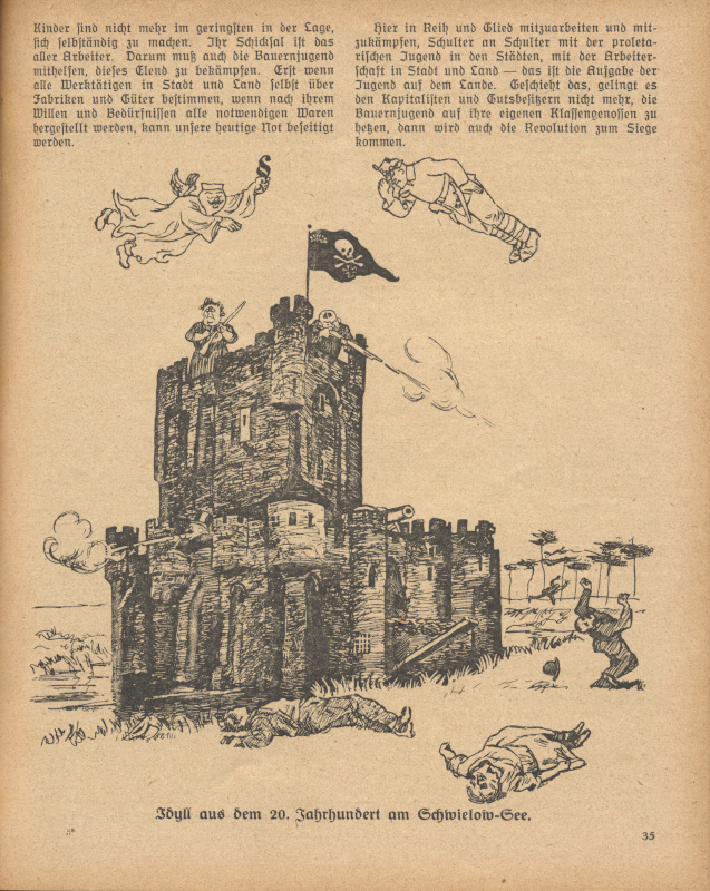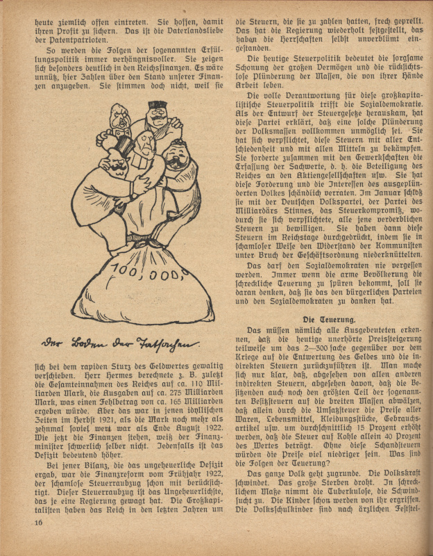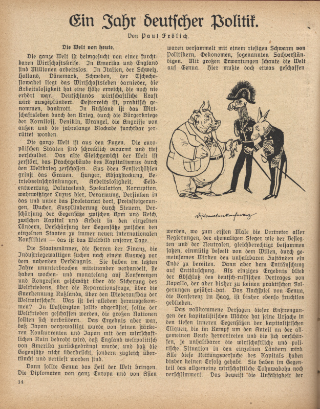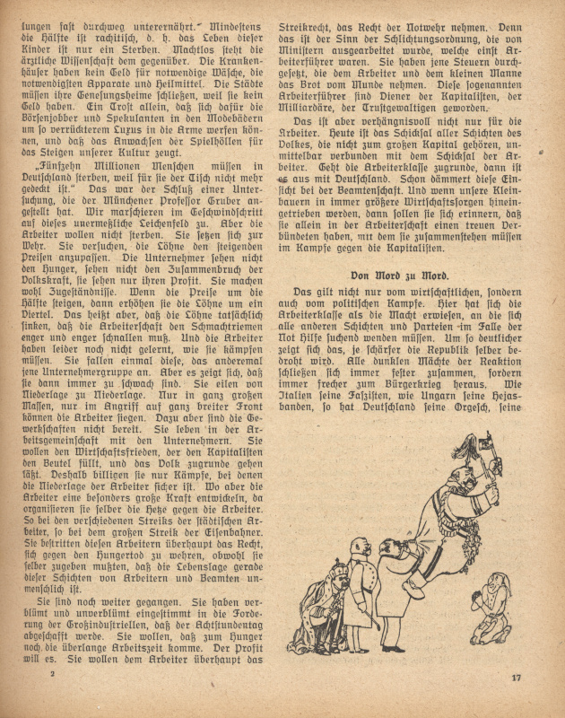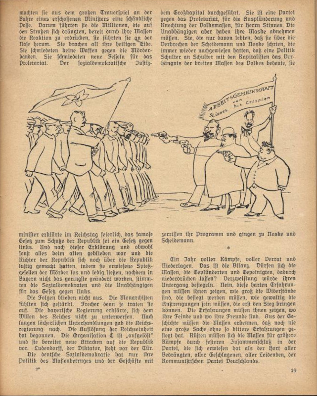 Das Kalendarium (Federzeichnungen) wohl auch von Karl Holtz, die Textillustrationen zu "Ein Jahr deutscher Politik" von Paul Frölich ebenfalls unsigniert, dagegen 'TZ' auf der Zeichnung Seite 23: Wie lange noch?
